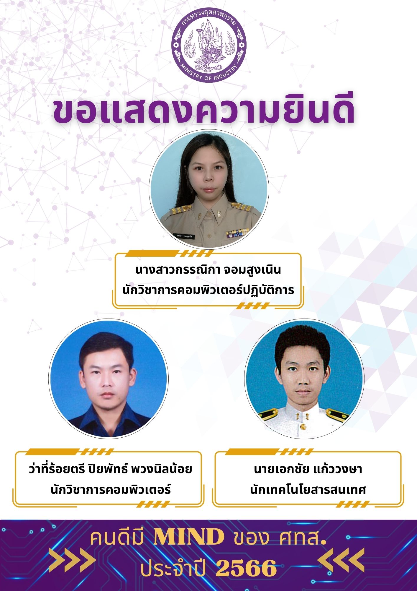 ขอแสดงความยินดีกับผู้ได้รับคัดเลือก "คนดีมี MIND ของ ศทส." เพื่อเป็นการยกย่องเชิดชูเกียรติผู้ที่ประพฤติปฏิบัติตนเป็นแบบอย่างที่ดีของหน่วยงาน ของศูนย์เทคโนโลยีสารสนเทศและการสื่อสาร สำนักงานปลัดกระทรวงอุตสาหกรรม ได้แก่